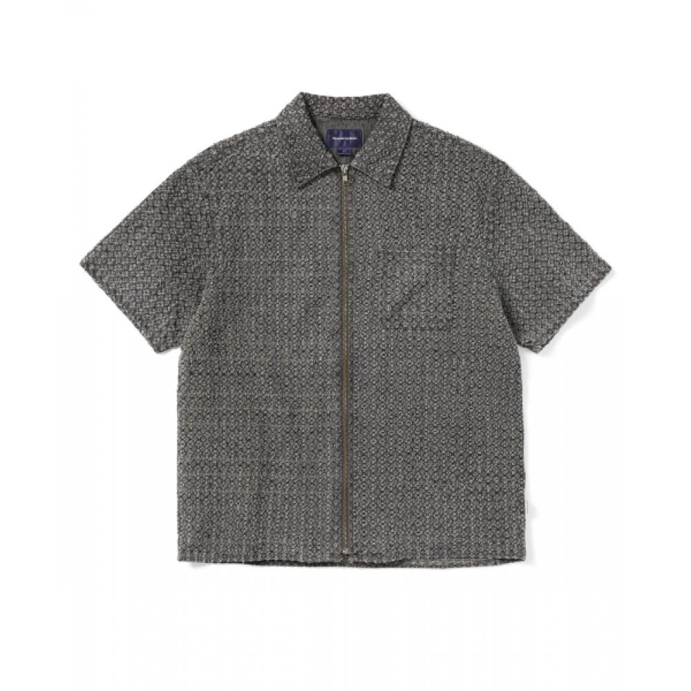 THISISNEVERTHAT Damaged Denim Zip S/S Shirt Grey features a classic denim style with a unique damaged design. The YKK metal zipper is located at the center front, adding stylishness. The pleat treatment on both sides of the back yoke enhances mobility. A design label is attached to the lower side seam.
