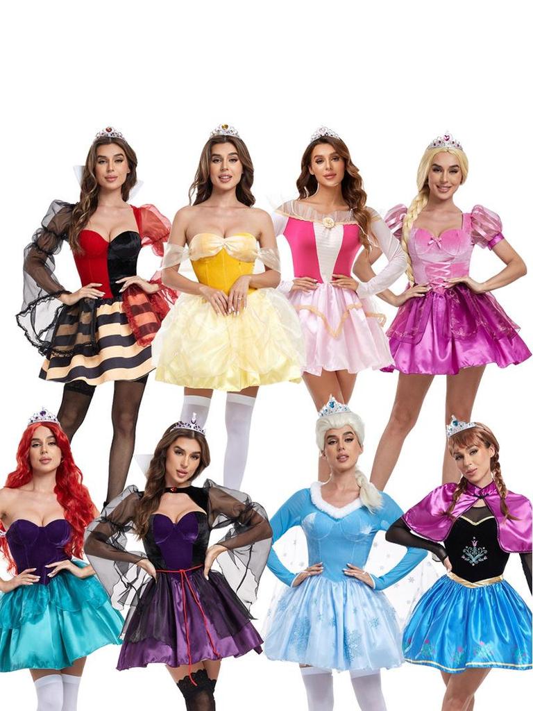 Disney Princess and Villain Cosplay Costumes: Snow White, Belle, Anna, Ariel, Evil Queen, Sleeping Beauty, Red Queen.