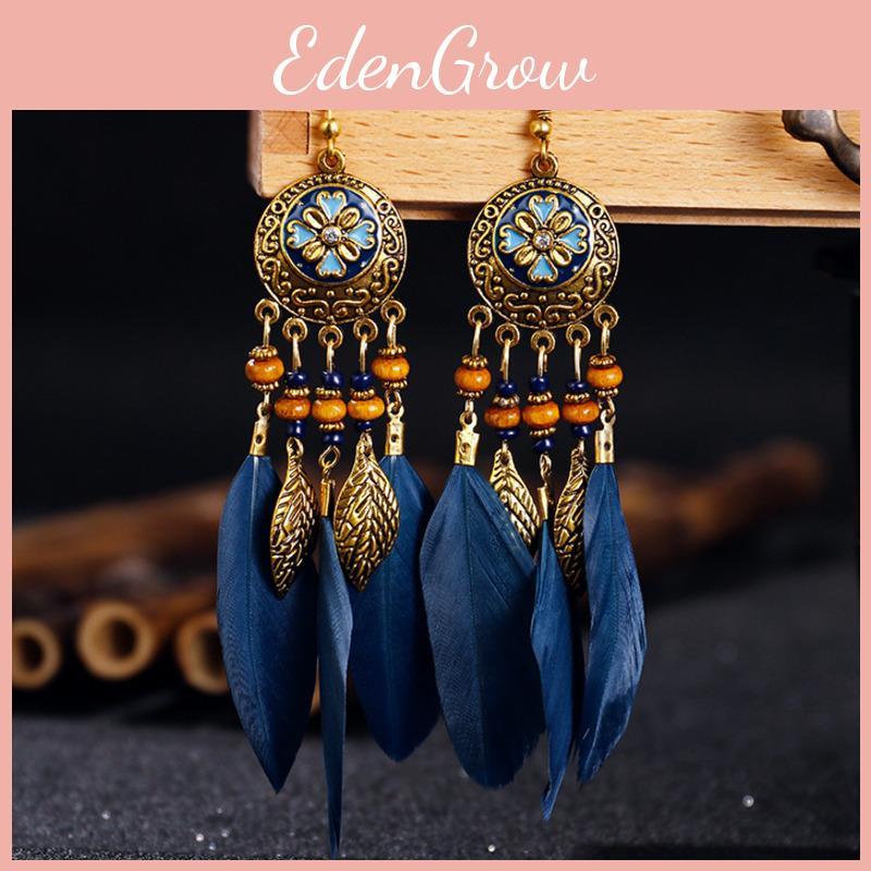 bohemian earrings, vintage feather earrings, boho festival jewelry, antique alloy earrings, retro statement earrings, summer boho accessories, ethnic inspired earrings, layered tassel earrings