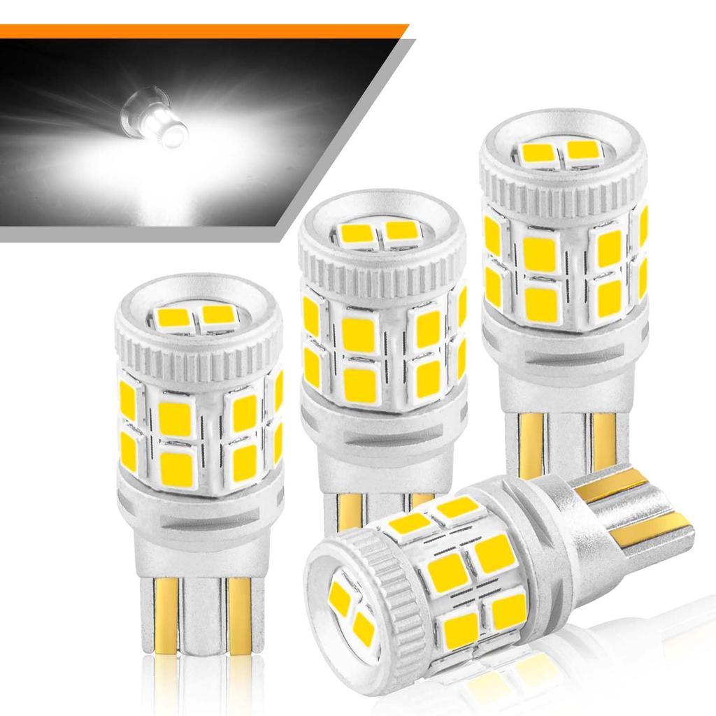 T10 LED Product Specifications: Power Consumption: 3W / Color Temperature: 6000K / Color: White / LED Chip: SMD2835 / Voltage: DC 12V / Lumens: 380LM. Built-in CANBUS canceller for error-free operation in most vehicles. Set of 4 T10 bulbs for 12V vehicles.