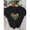 European Size 1pc Women's Summer Short-sleeve T-shirt - 2D Geometric Heart Pattern with Mountain Flowers and Sunrise, Symbolizing Adventure