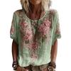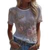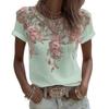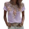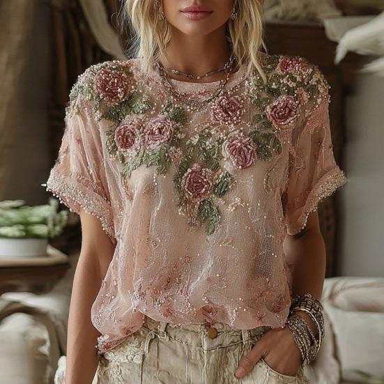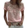 Women Tops Round Neck Short Sleeve Pullover Tops Loose Fit Faux Pearls 3D Floral