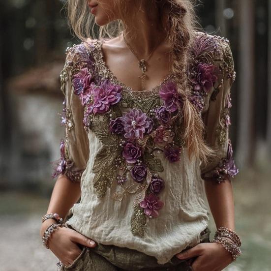 Crafted from natural linen fabric, it offers softness, breathability, and excellent moisture-wicking properties to keep you cool and comfortable during warm spring and summer days. The exclusive retro printing art inspired by classic paintings adds soft colors and rich layers, while splicing details on the collar and cuffs enhance visual appeal.