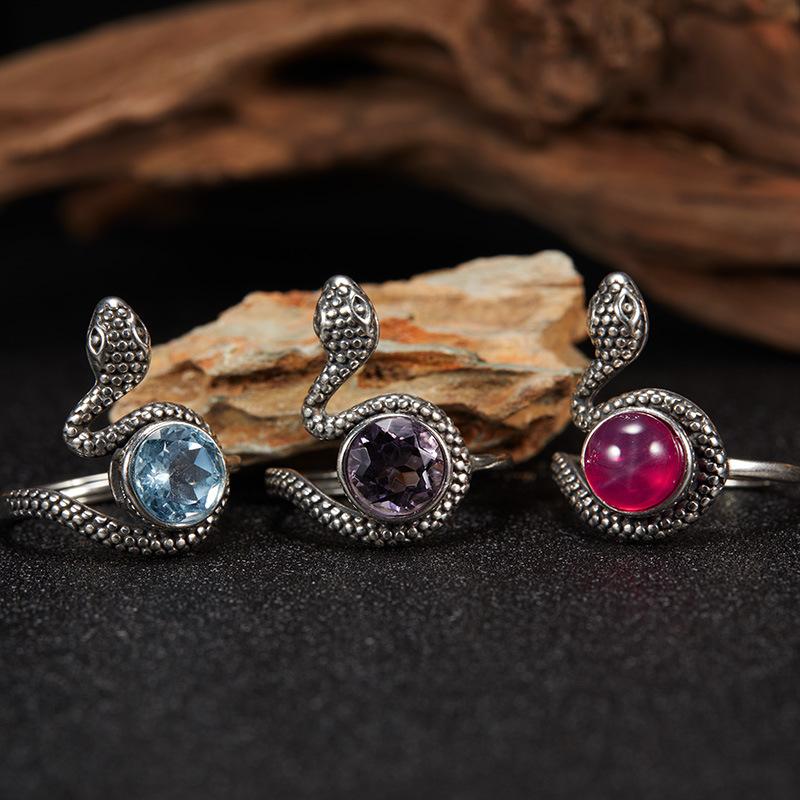 S925 Sterling Silver Natural Amethyst Topa Cat Eye Colored Treasure Thai Silver Ring Snake Hipster Personality Exaggerated Open Ring