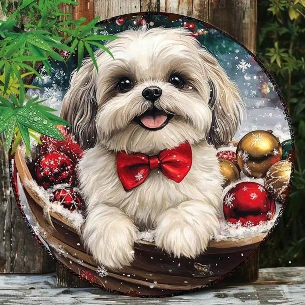 8" Round Metal Wall Decor Shiba Inu Dog Christmas Wreath Sign Holiday Festive Home Art