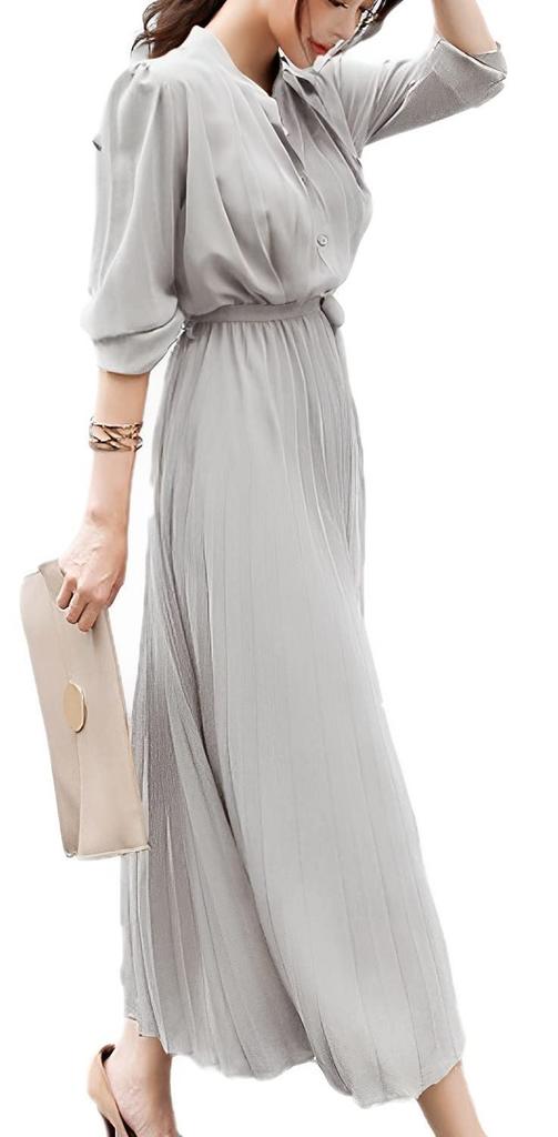 This easy-to-wear waist-tied pleated shirt dress features a flowing, pleated midi skirt for a touch of elegance. The ribbon and pleats create a refined and elegant look. Perfect for wedding receptions, parties, thank-you parties, dinner parties, and everyday wear, this versatile piece is perfect for both formal and casual occasions. The long maxi length elongates the legs and creates a slimming effect. The sleek design, accented with ruffles, a belt, and chiffon pleats, exudes a feminine, cute, and glamorous look. The long sleeves make it perfect for spring, fall, and winter office wear. It's also perfect for spring and summer resorts and parties. Crafted from a refreshing summer fabric, this relaxed and comfortable dress is available in plus sizes, making it suitable for all body types. It can be worn for formal occasions such as weddings, school visits, and parties, as well as for everyday casual styling, giving an elegant and stylish impression. Be sure to add it to your spring wardrobe and enjoy a stylish and beautiful long dress.