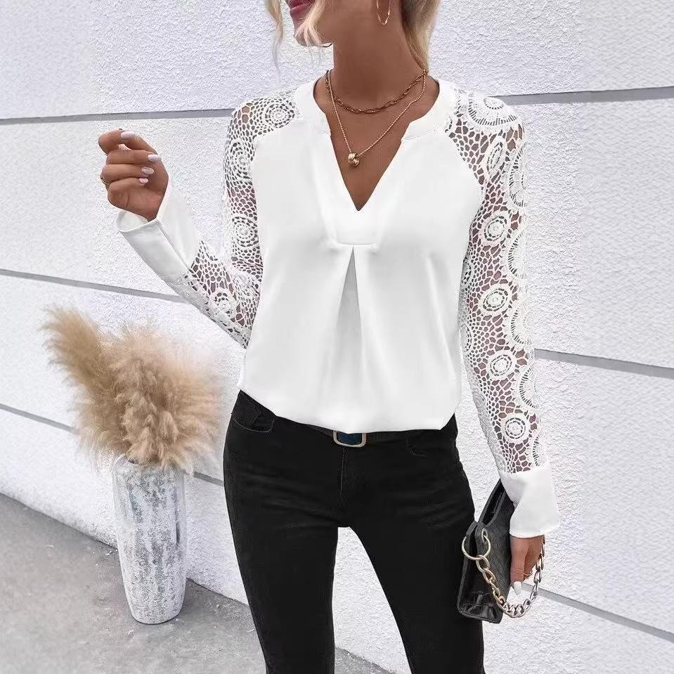 Women's White Lace V-Neck Long Sleeve Ruffle Blouse for Spring and Autumn