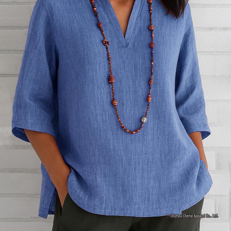 2026 European & American Women's V-Neck, 3/4 Sleeve Cotton Linen Loose Casual Top
