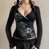 Y2K Spicy Girl V-neck Floral Long Sleeve Slim Fit Waist Cinched Retro Top