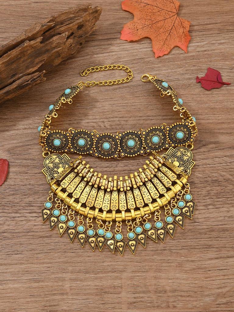 This boho necklace features a geometric pendant crafted from zinc alloy with a gold-toned electroplated finish, delivering durability and a vintage-inspired look. The multi-layer water chain measures 16.1 to 19.7 inches in length and weighs 138 grams, creating a bold, artistic statement. Ideal for autumn 2025 fashion, it complements ethnic and festival outfits. Wipe with a soft cloth for maintenance.