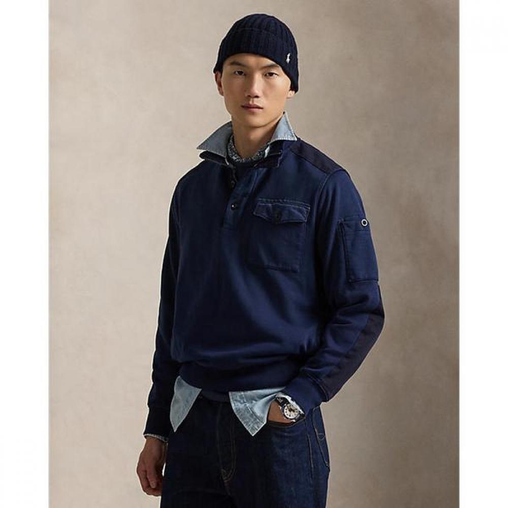 ribbed cuffs, long sleeve, woven patches on shoulder and elbow, button pocket on left sleeve, 'Polo Ralph Lauren Outdoors Expedition Equipment' label on right sleeve