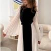 Elegant Black & White Pleated Dress - Round Neck, Loose Long Sleeve