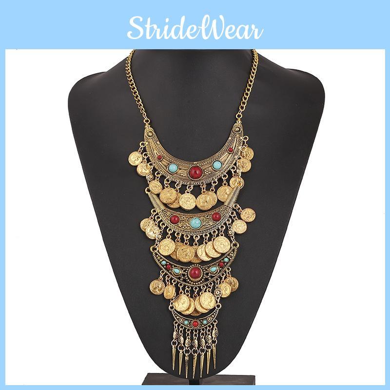 Vintage Coin Tassel Pendant Necklace With Multilayer Chain For Boho Style Women