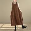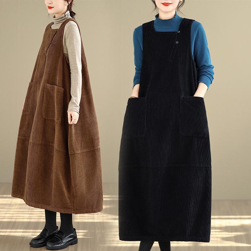 2025 Winter Women's Long Loose Fit Washed Cotton Corduroy Skirt with Square Neck and Slit, Stylish and Slimming Design