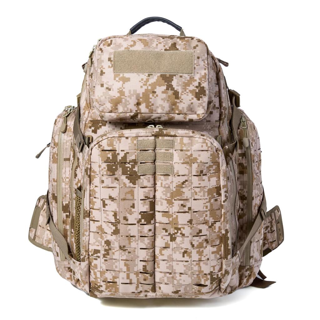 [Large capacity and easy storage] Capacity: 55 liters. Includes one assault pouch. The pouch can be mounted on MOLLE webbing PALS laser-cut system. The assault pouch has a means of draining water. The top of the pouch has a slide zipper for secure closure. The front tactical compartment is also designed with laser-cut PAL, allowing you to attach irregularly shaped equipment such as helmets, skis, snowshoes, and shoulder-mounted assault gear.