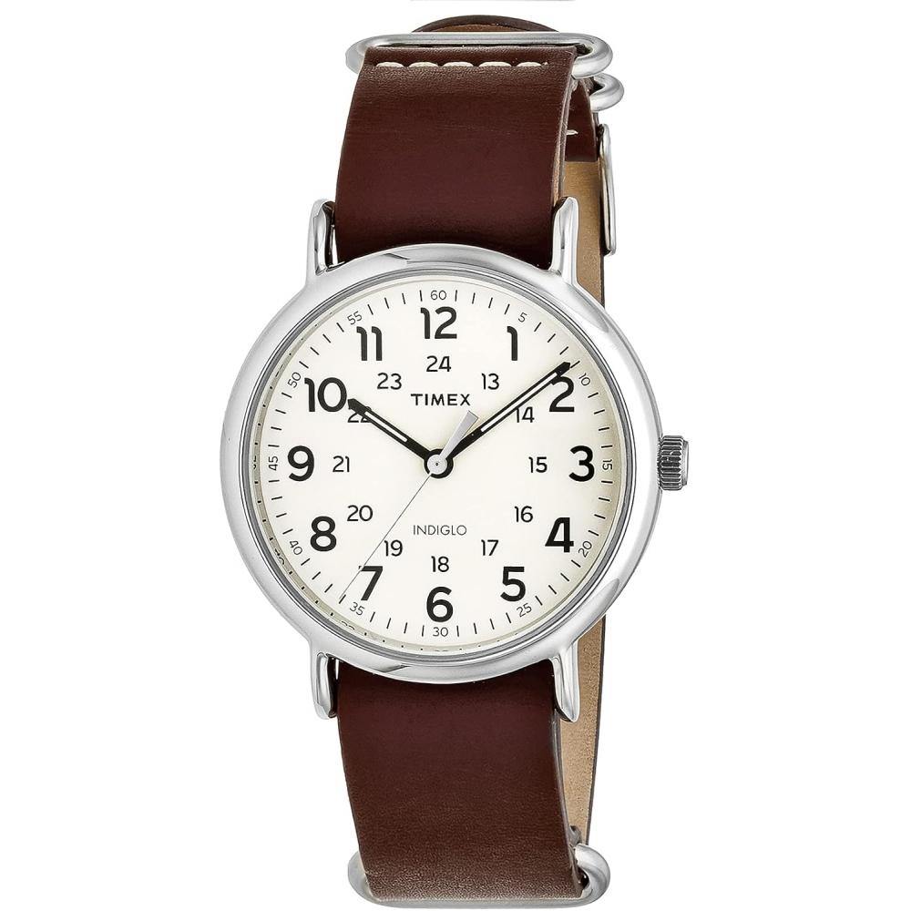 The No Timex Weekender men's watch features a clean and friendly white dial design. The bright white dial, combined with a neat index, offers a casual yet sophisticated feel. The brown leather band adds a natural warmth, creating a soft and user-friendly combination. This watch provides a lightweight wearing experience and blends well with denim, chinos, and shirt styles. Furthermore, it is equipped with TIMEX's proprietary technology, Indiglo night light, which lights up the entire dial in teal when the crown is pressed, ensuring high visibility even in dark places.