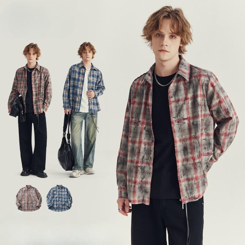 Spring and Autumn Men's Plaid Long Sleeve Retro Rave Loose Lap Collar Shirt Jacket