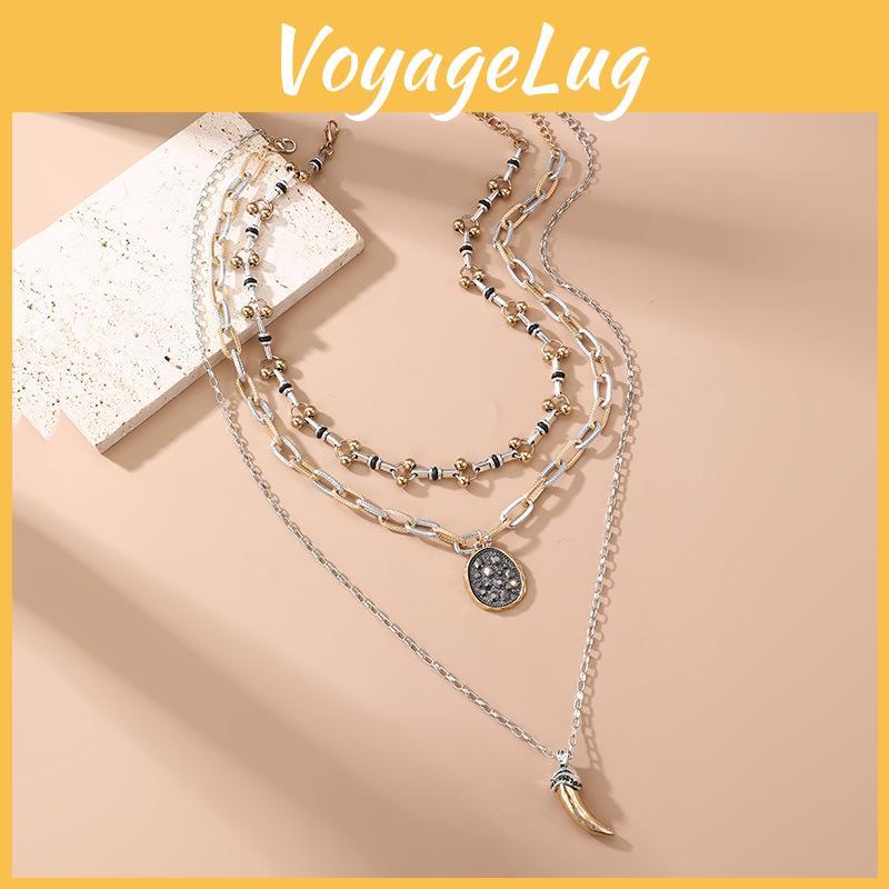 This geometric alloy pendant necklace features a layered chain design with a zinc alloy construction and electroplated finish, measuring 12.2 to 15.7 inches in length. Its modern shape and circle accents add a stylish punk vibe. Ideal for casual or streetwear outfits, it enhances personal expression. Wipe clean with a soft cloth to maintain its appearance.