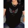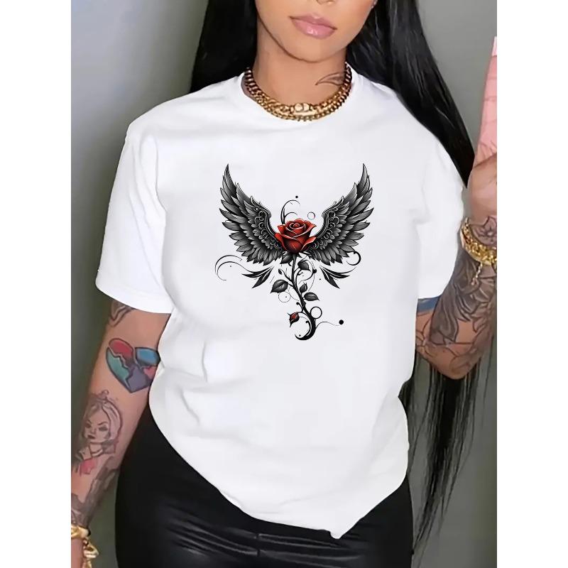 European Size Angel Wing Rose Graphic Women's Fashion Casual Sporty T-Shirt with Crew Neck, Polyester Blend