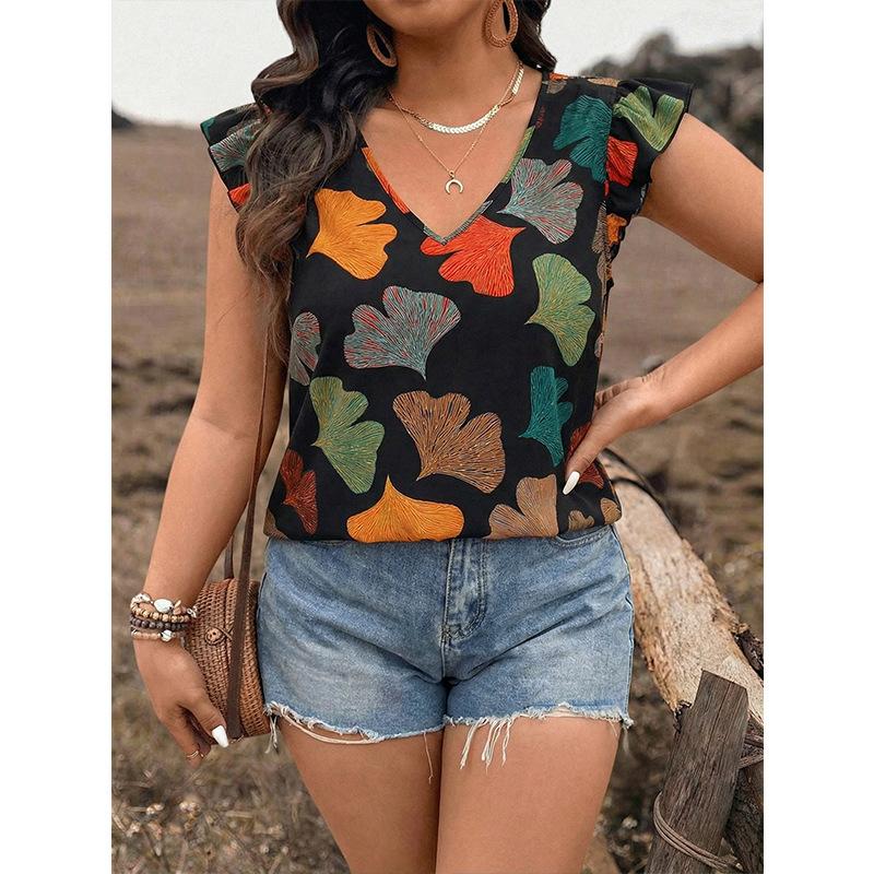 New Large-sized Sleeveless Top with V-neck and Ruffled Hem. Loose Printed Short Sleeves.
