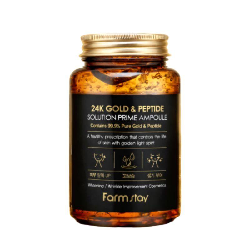 Indulge in a royal skincare experience with the Farm Stay 24K Gold & Peptide Solution Prime Ampoule. This premium 2-pack set provides a total of 500ml of high-performance anti-aging care. Infused with 99.9% pure gold flakes and a potent peptide complex, this multifunctional ampoule targets the core signs of aging—loss of elasticity, wrinkles, and dullness. Its lightweight, non-sticky gel texture absorbs rapidly, leaving your skin with a sophisticated golden glow and a firmer, more youthful appearance.