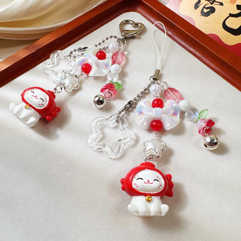 Cute Cartoon Lucky Cat Bead Keychain Kawaii Kitten Mobile Phone Chain Backpack Pendant Car Key Chain Accessories Gifts