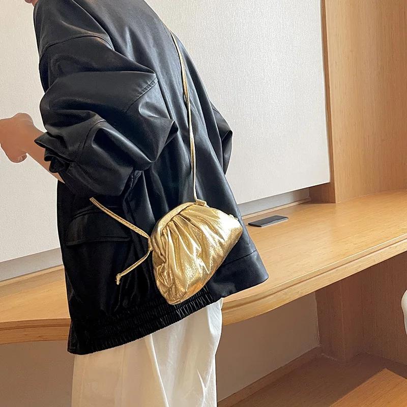 Small Luxury Design Women's Soft PU Leather Gold Silver Cloud Hobo Bag Elegant Dressy Handbag Ruched Dumpling Party Clutch Purse