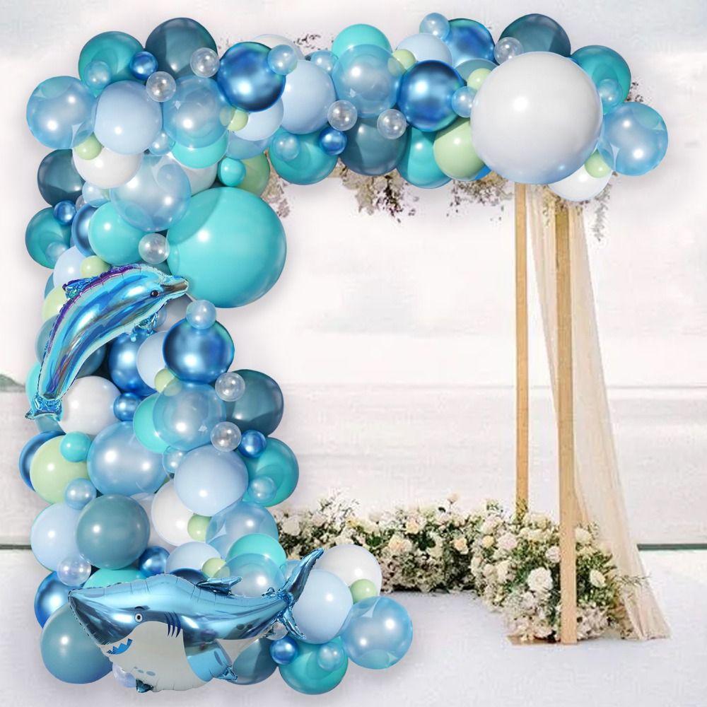 Vibrant Ocean-Themed Balloon Garland Kit - Elevate your event with our balloon garland kit, containing 103 balloons including shark and dolphin balloons, teal, white, pastel blue, pearl blue, metallic blue, pastel green, dusty blue, and transparent balloons in varying sizes. Idea for any occasion needing a splash of sea fantasy