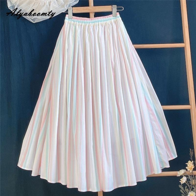 Spring Summer Women Rainbow Feminine Skirt Elastic Waist Pastel Striped Contrast Color Midi Skirt Cotton Soft Stylish Skirts Womens
