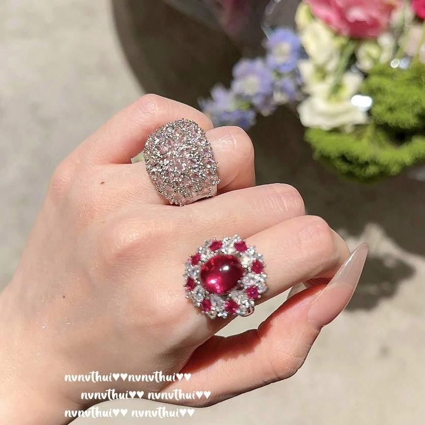 Papalacha Bouquet Gemstone Earrings, Duobao Thistle, 18K Gold Plated, Rouge Magenta Flower Zircon Ring