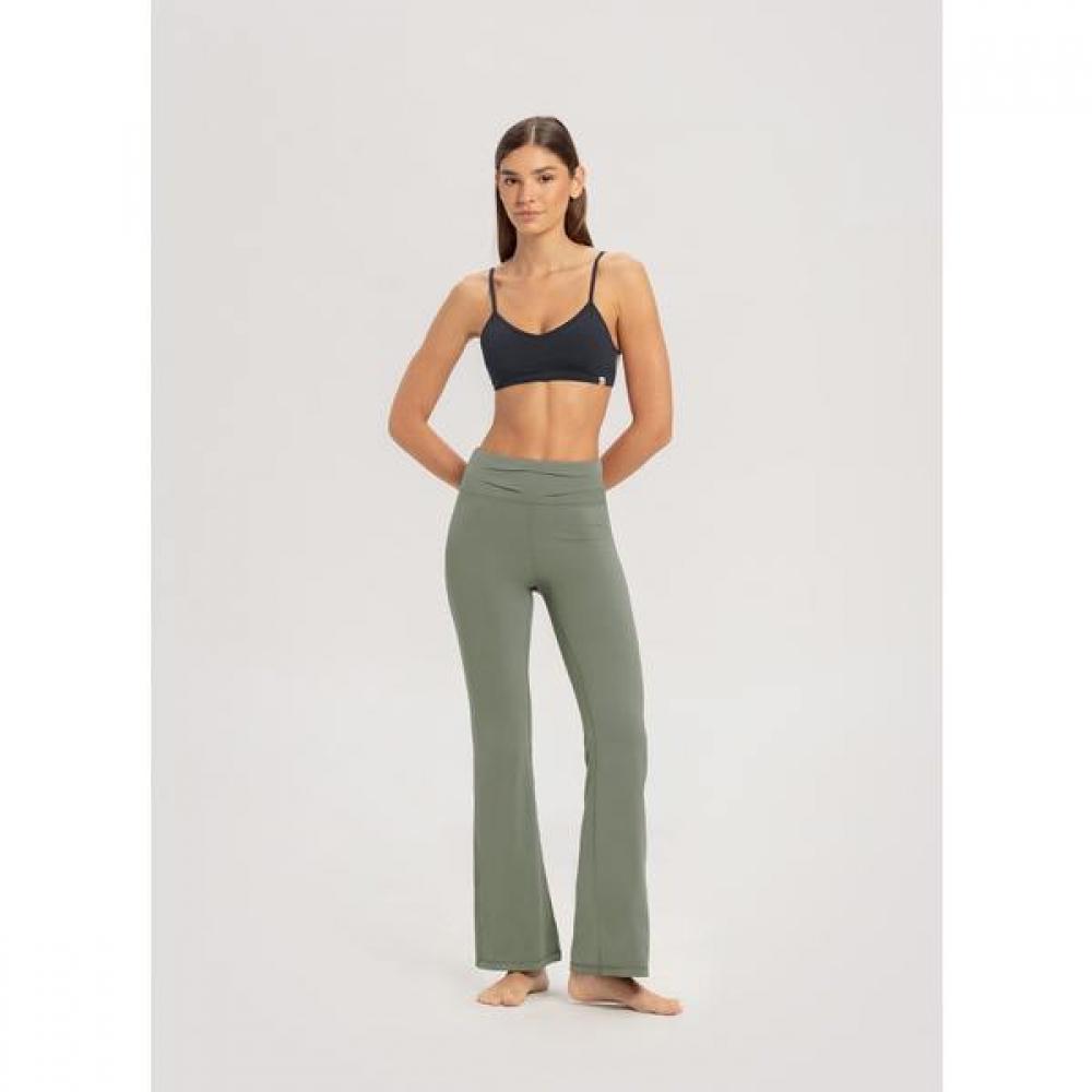 The [Movement Line] Shirring Flare Pants feature a high-waist flare fit design made with a stretch nylon-spandex material that has a matte appearance. The tuck detail at the waist complements body shape while providing a comfortable fit with a generous length. The Budhi Mudra logo serves as a design accent.