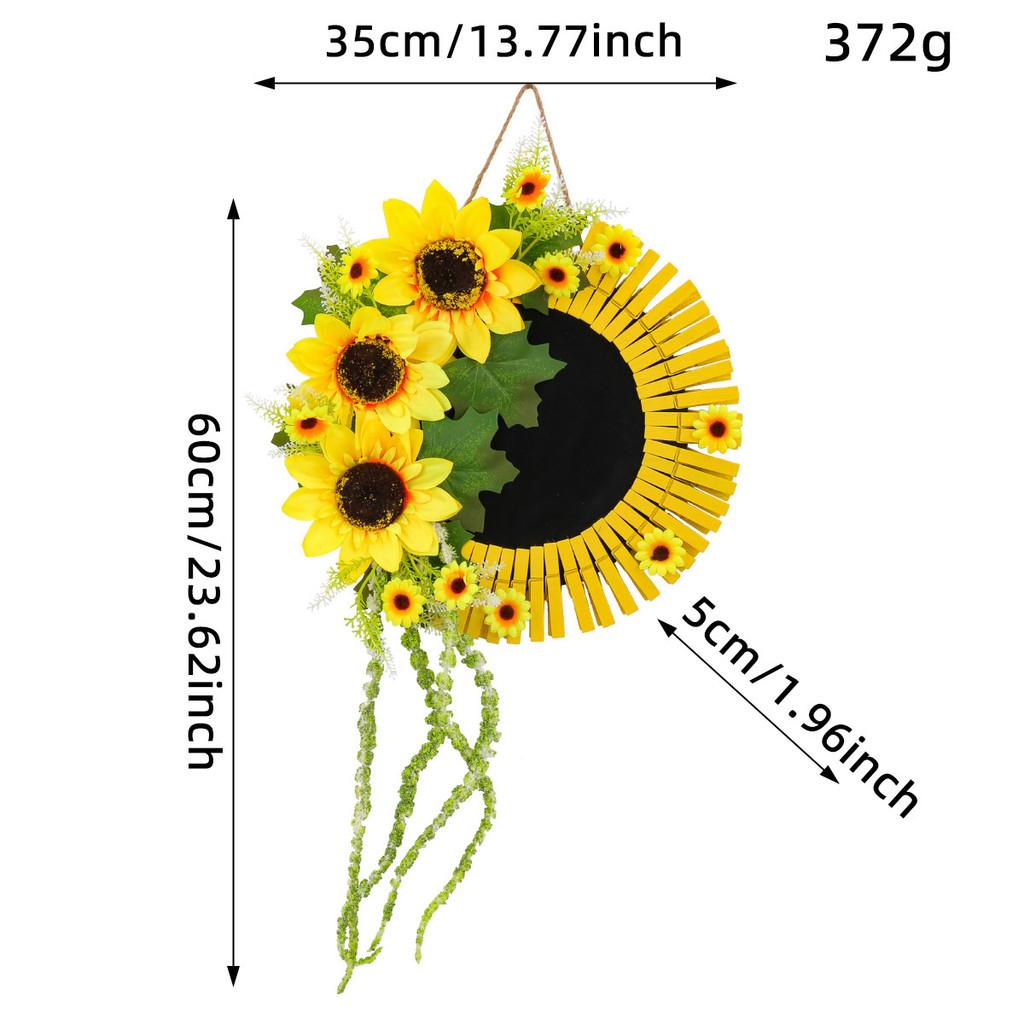 The sunflower-themed decorative wall hanging features realistic artificial sunflowers crafted from durable plastic and polyester, measuring approximately 35 cm in diameter. Designed with a sturdy clip, it easily attaches to doors or walls, enhancing garden or patio spaces. Ideal for spring and autumn seasonal decor or outdoor events. Wipe clean with a damp cloth for maintenance.