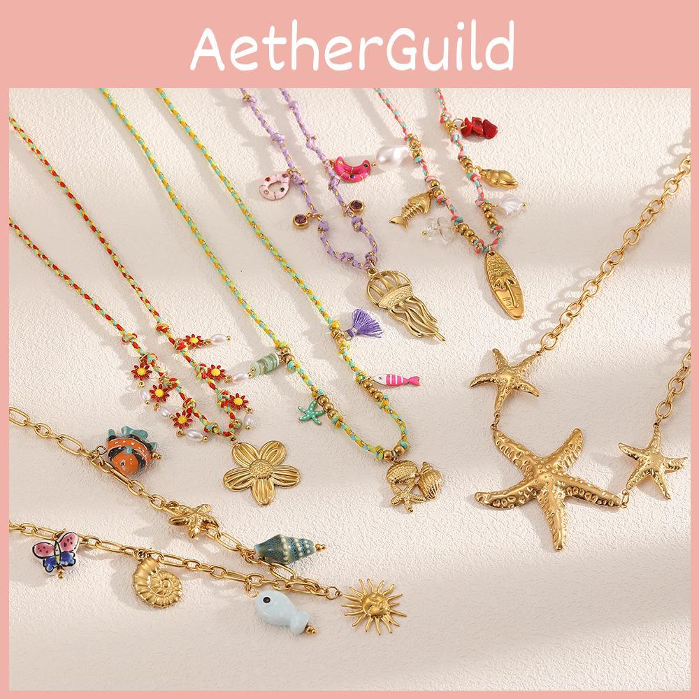 This stainless steel necklace features a coastal-inspired design with shell, starfish, and tropical fish accents, perfect for summer beach vacations. Measuring 16.14 to 19.69 inches in length and weighing 15 grams, it offers lightweight comfort. Crafted with electroplated finish and durable titanium steel pendants, it suits casual seaside outings and daily wear. Wipe clean with a damp cloth to maintain its shine.