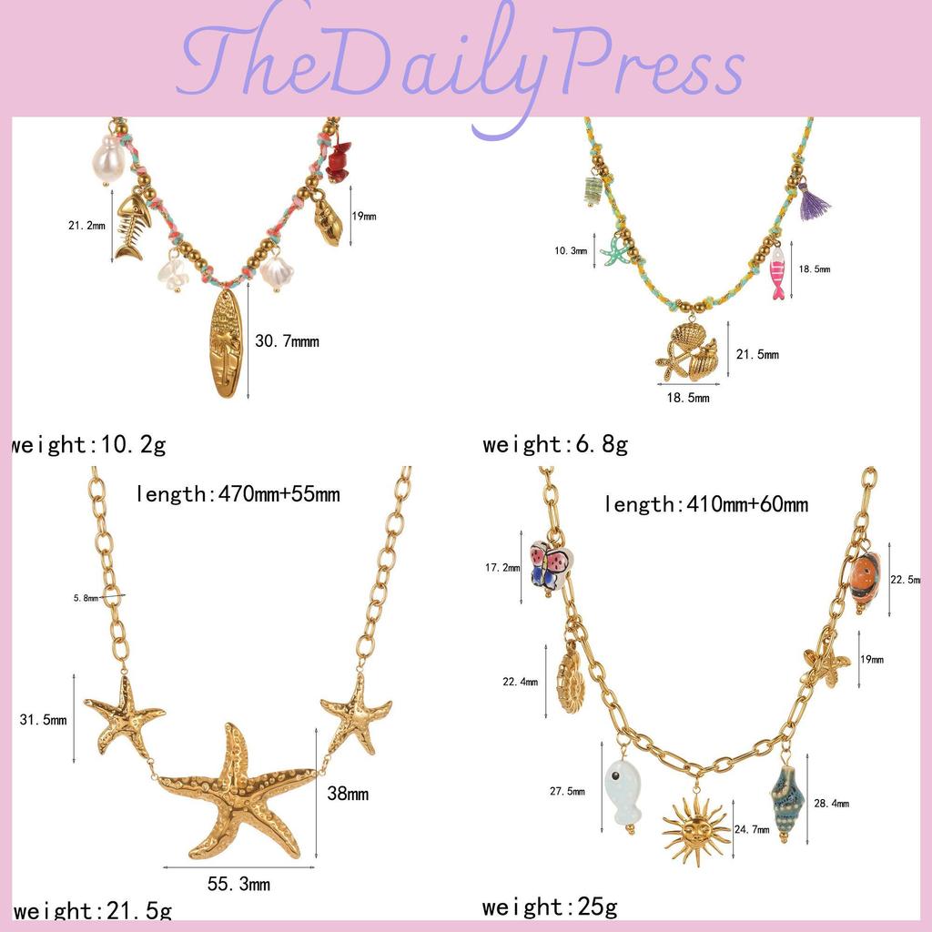 This stainless steel necklace features a coastal-inspired design with shell, starfish, and tropical fish accents, perfect for summer beach vacations. Measuring 16.14 to 19.69 inches in length and weighing 15 grams, it offers lightweight comfort. Crafted with electroplated finish and durable titanium steel pendants, it suits casual seaside outings and daily wear. Wipe clean with a damp cloth to maintain its shine.