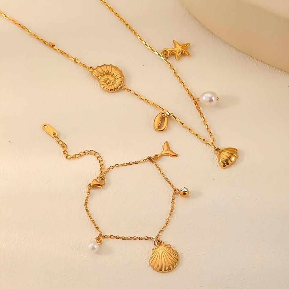 This stainless steel necklace features a sleek geometric design with a shell-inspired pendant, adding a touch of oceanic elegance. Supporting daily wear. Suitable for casual or office settings, it complements a variety of outfits. Wipe clean with a soft cloth to maintain its finish.