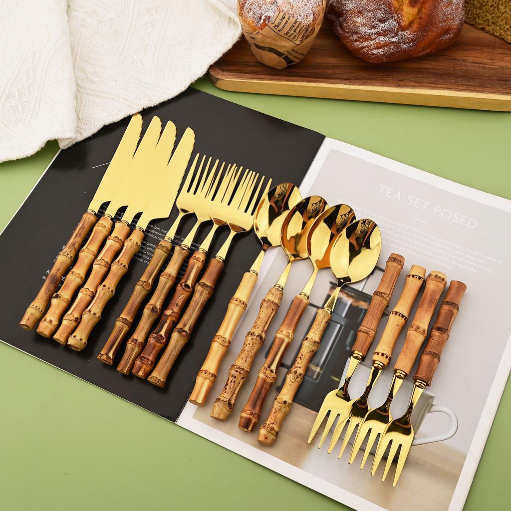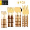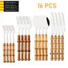 16 PCS Bamboo Handle Flatware Set, Stainless Steel Silverware Set for 4, Knives Forks Spoons and Tea Fork Set, Use For Home Kitchen Party and Travel