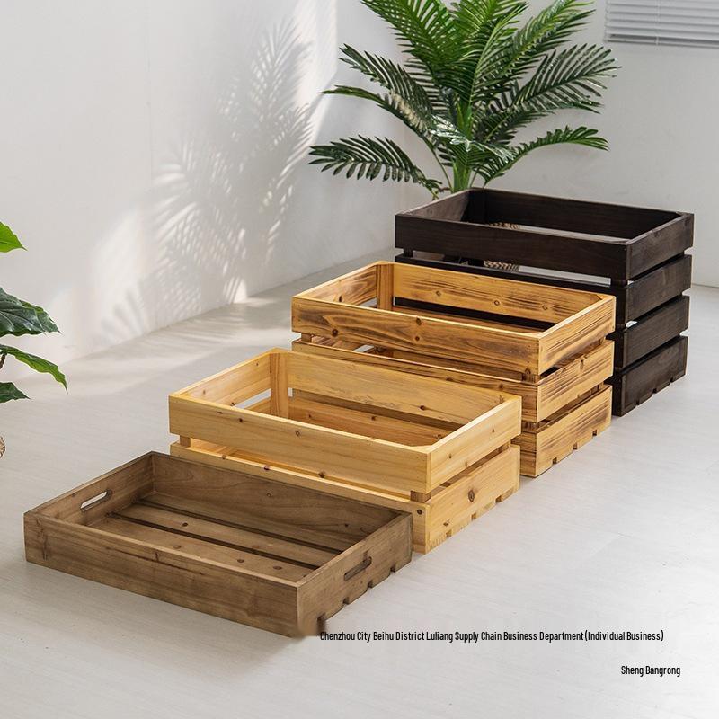 Vintage Wooden Storage Box with Frame - Solid Wood Display Basket