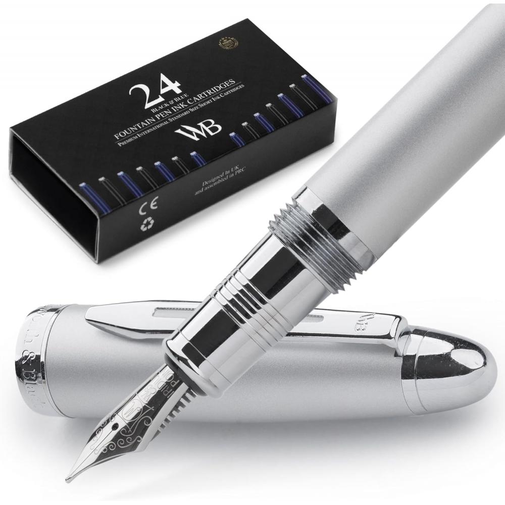 The Wordsworth & Black Black Majesti Fountain Pen comes in an exquisite premium case with a luxurious metallic silver lacquer and is finished with 24K gold on an 18K gold plated medium nib. This pen is perfect for calligraphy and writing and serves as an ideal business gift set for both men and women.