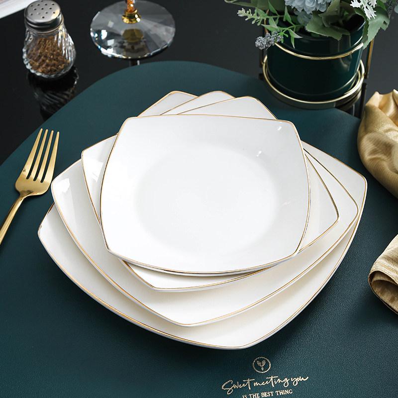 Gold-Rimmed White Ceramic Square Plate for Home: Dinner, Steak, Pasta, Dessert, Flat, or Shallow Use