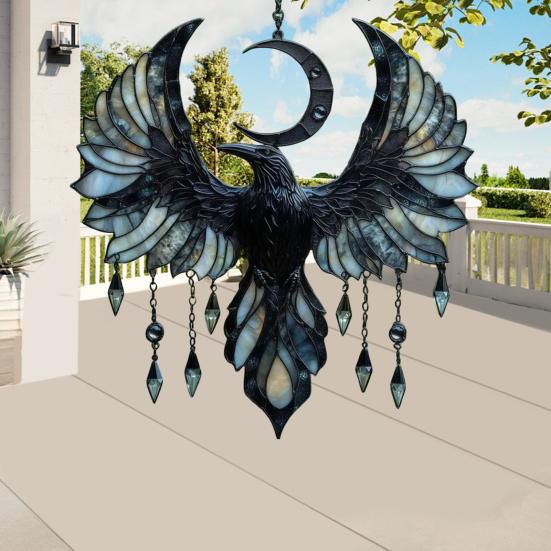 This Crescent Moon Raven Acrylic sun catcher beautifully combines mystery and elegance, featuring a crow perched on a new moonsymbols of wisdom, freedom, and the enchanting night. Crafted from high-quality, transparent acrylic, it refracts sunlight to create stunning light and shadow effects that brighten any room.