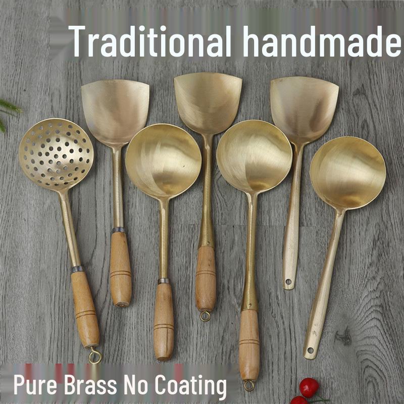 Handcrafted Brass Wok Spatula & Copper Spoon Set with Wooden Handles, Uncoated Raw Brass Utensils for Household Use