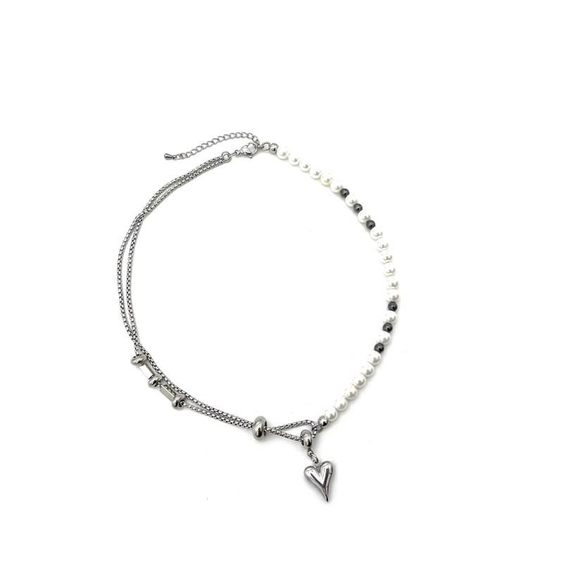 This vintage-style layered necklace features a heart-shaped pendant crafted from stainless steel, combined with titanium steel accents. Measuring 8.27 to 19.69 inches in length, it offers a versatile accessory for daily wear. Its asymmetrical design with pearl-embellished chain enhances its distinctive, trendy look. Ideal for casual outings or street fashion, it can be adjusted for comfort and is suitable for both men and women. Wipe clean with a soft cloth to maintain its finish.