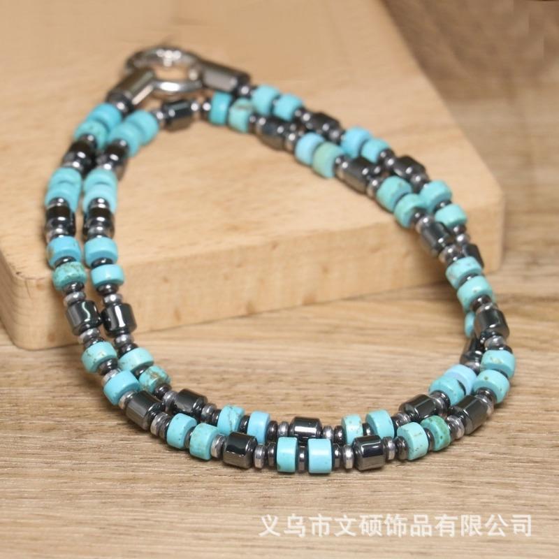 Turquoise Hematite Double Strand Necklace – Boho Tribal Jewelry, Protection Grounding Gift for Men Women