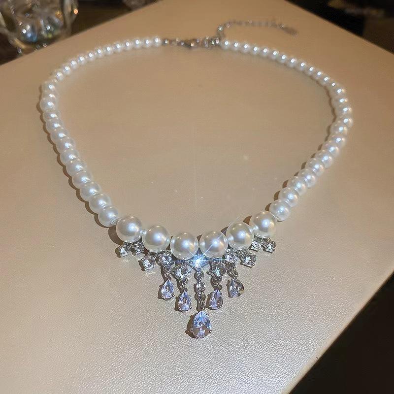 Romantic Design Sweet Cool Babes Wind Niche Zircon Water Drop Fringed Pearl Necklace Female Collarbone Chain Neck Chain Tide