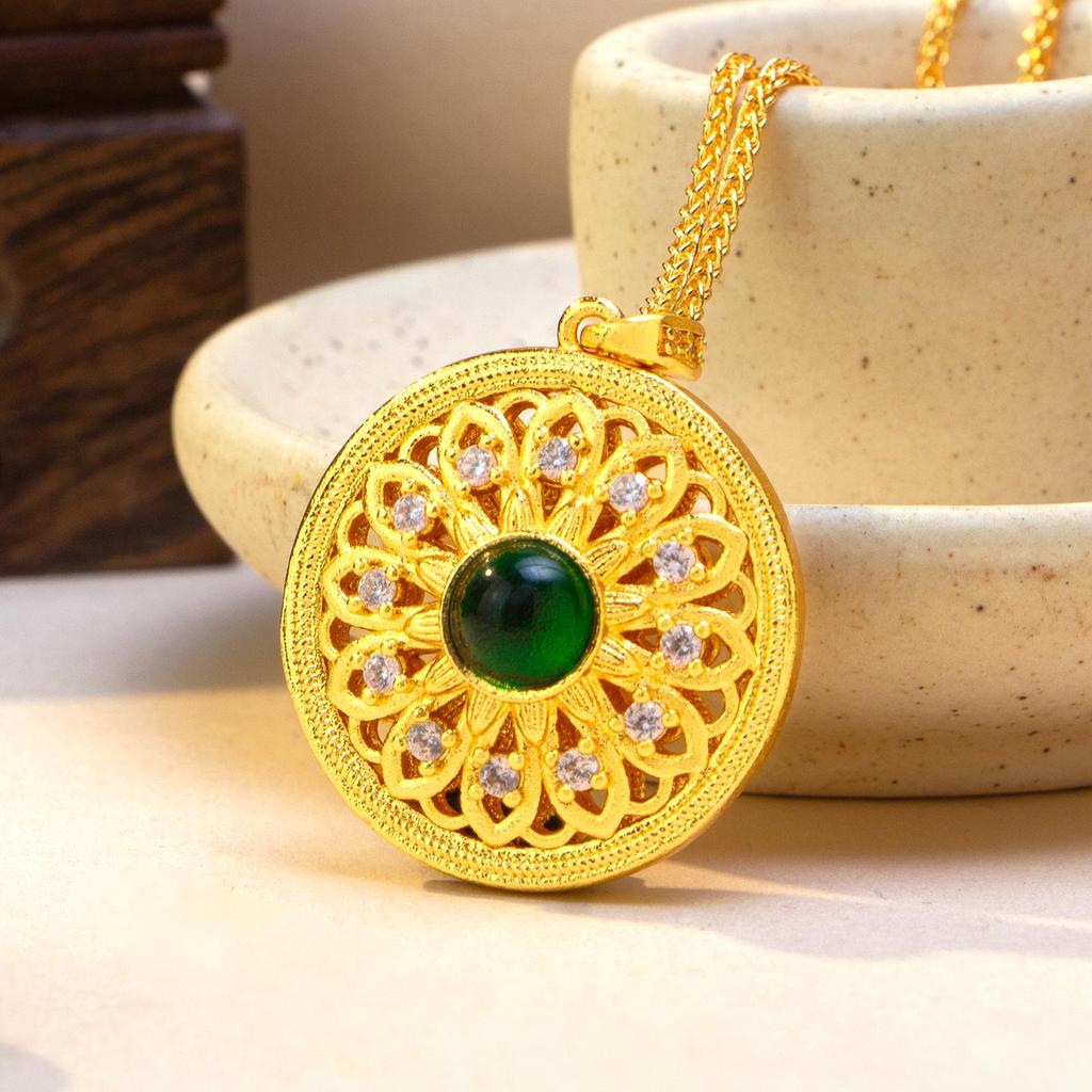 Sand Gold Sunflower Pendant with Rhinestones & Green Stone - Versatile Retro Clavicle Chain