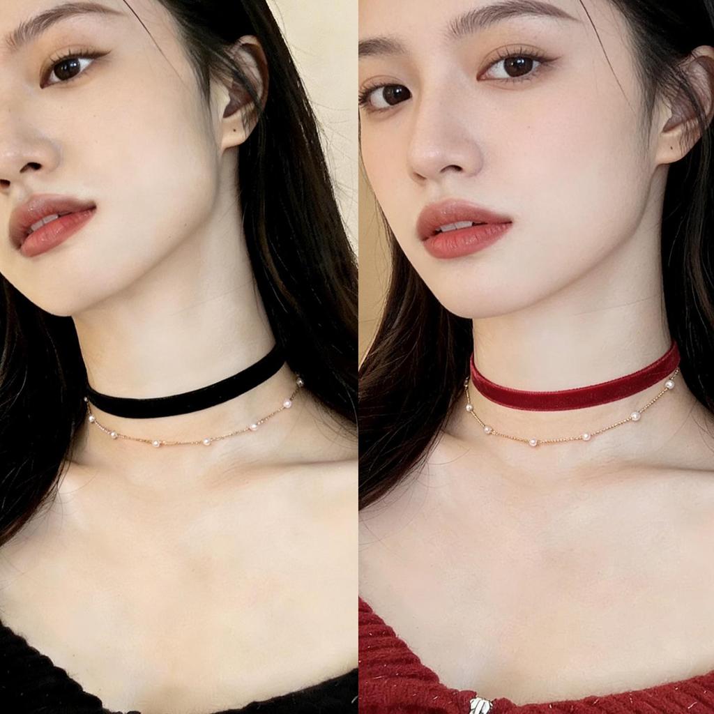 Vintage Wine Red Velvet Pearl Choker Necklace