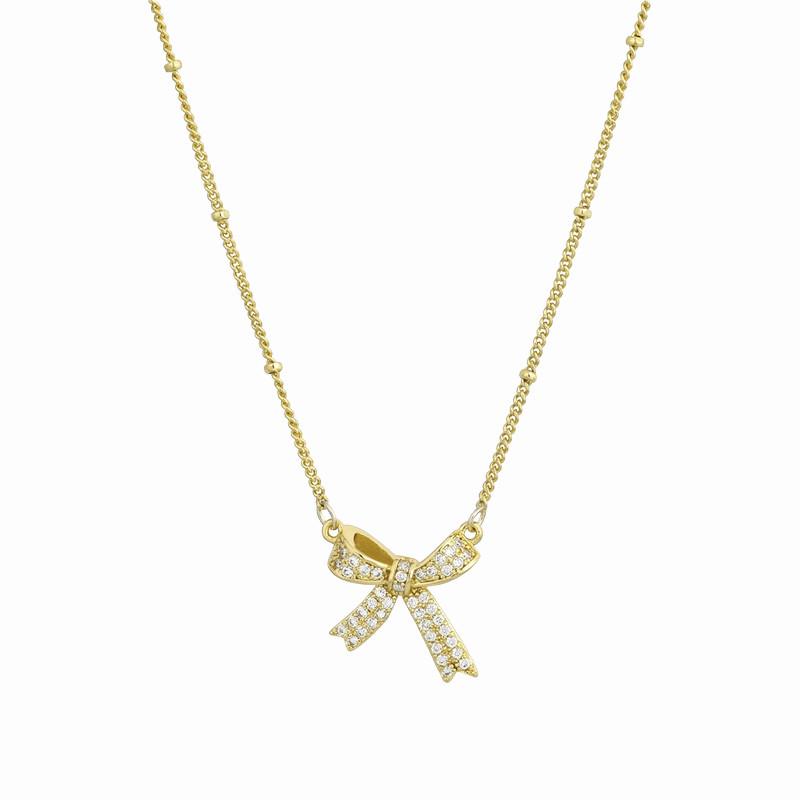 18K Gold Zircon Copper Bow Necklace with Full Diamond Clavicle Chain