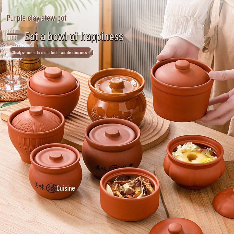 Purple Clay Double-Boiler Stew Pot with Lid - Chinese Retro Health Pot for Stews, Soups, and Steamed Eggs.