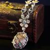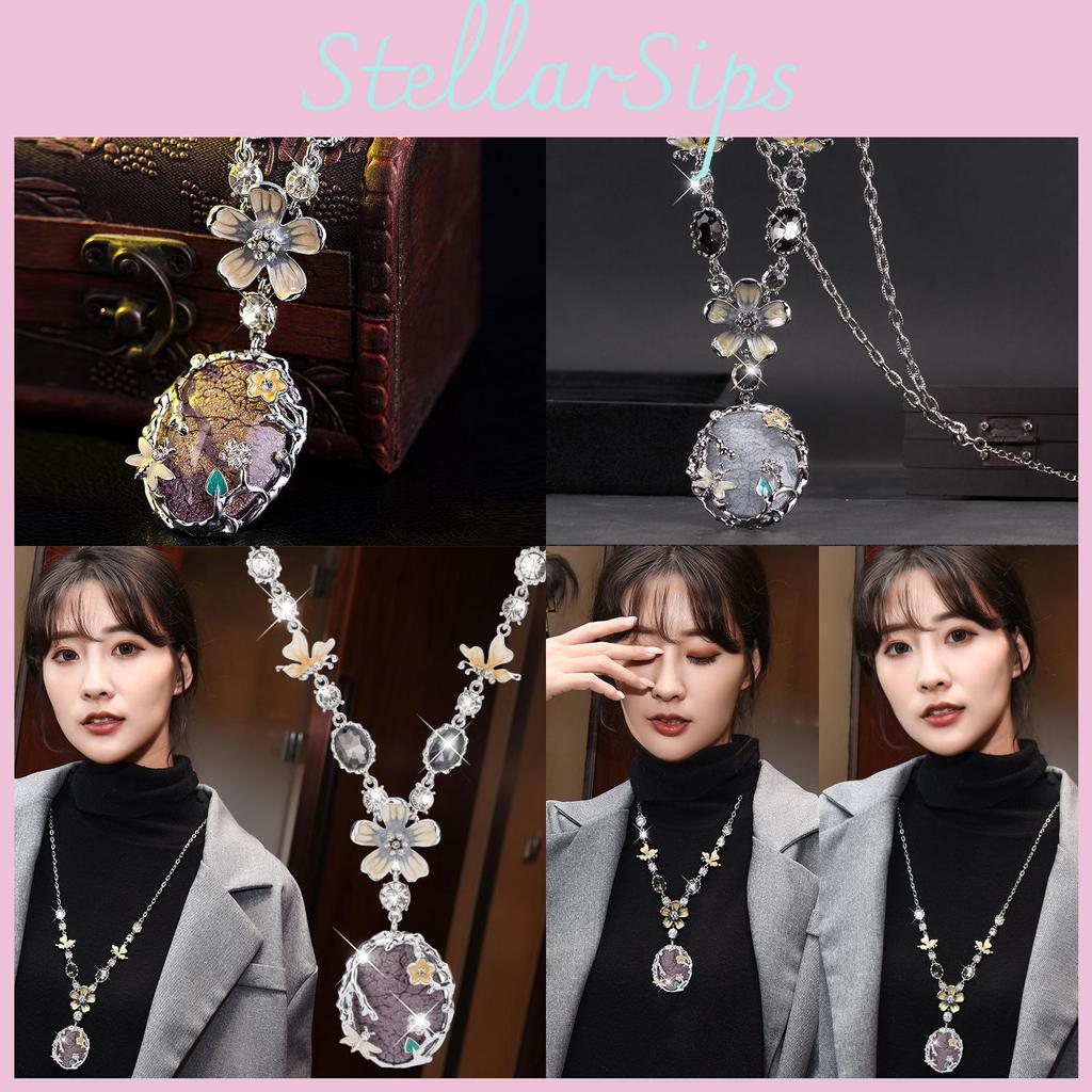 The necklace features a unique floral design that exudes femininity and grace. Its prominent elements include delicate crowns, enchanting eyes, whimsical butterflies, serene moons, and charming daisies, each meticulously detailed to create a captivating visual narrative. With a chain style that gracefully flows like rippling water, this accessory not only highlights your neckline but also adds a touch of sophistication to your ensemble. The mixed gemstone pendant serves as a dazzling centerpiece, reflecting light beautifully and drawing admiration from all who see it.