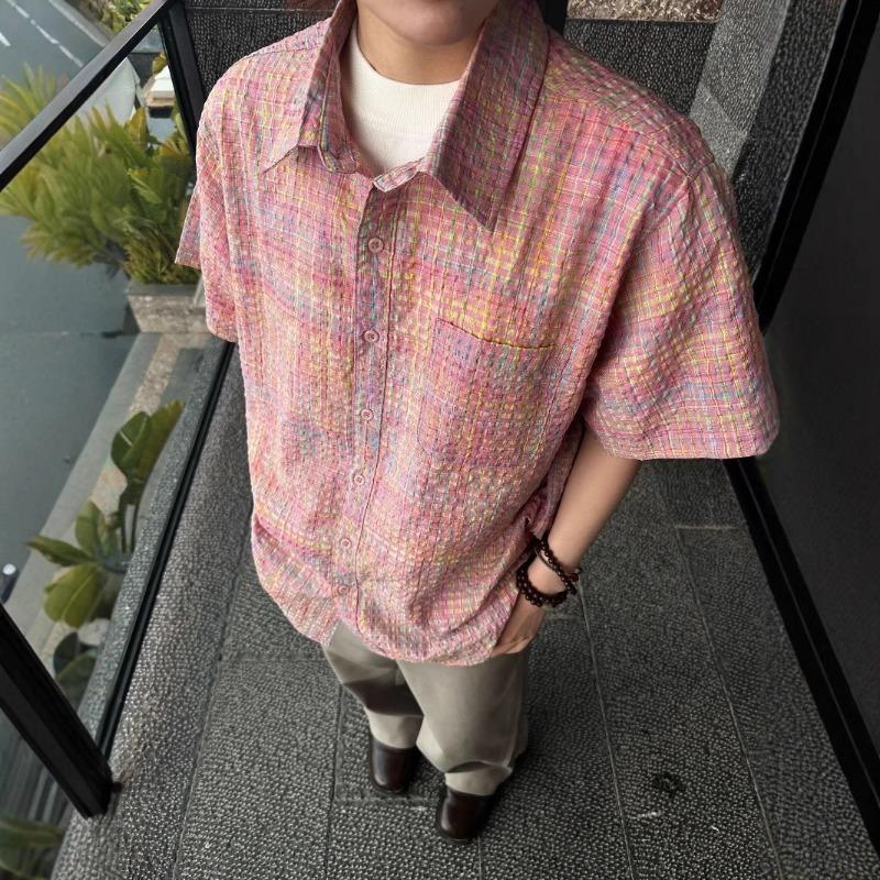 Men's Plaid Textured Short Sleeve Shirt Casual Pocket Detail Loose Fit Streetwear Top